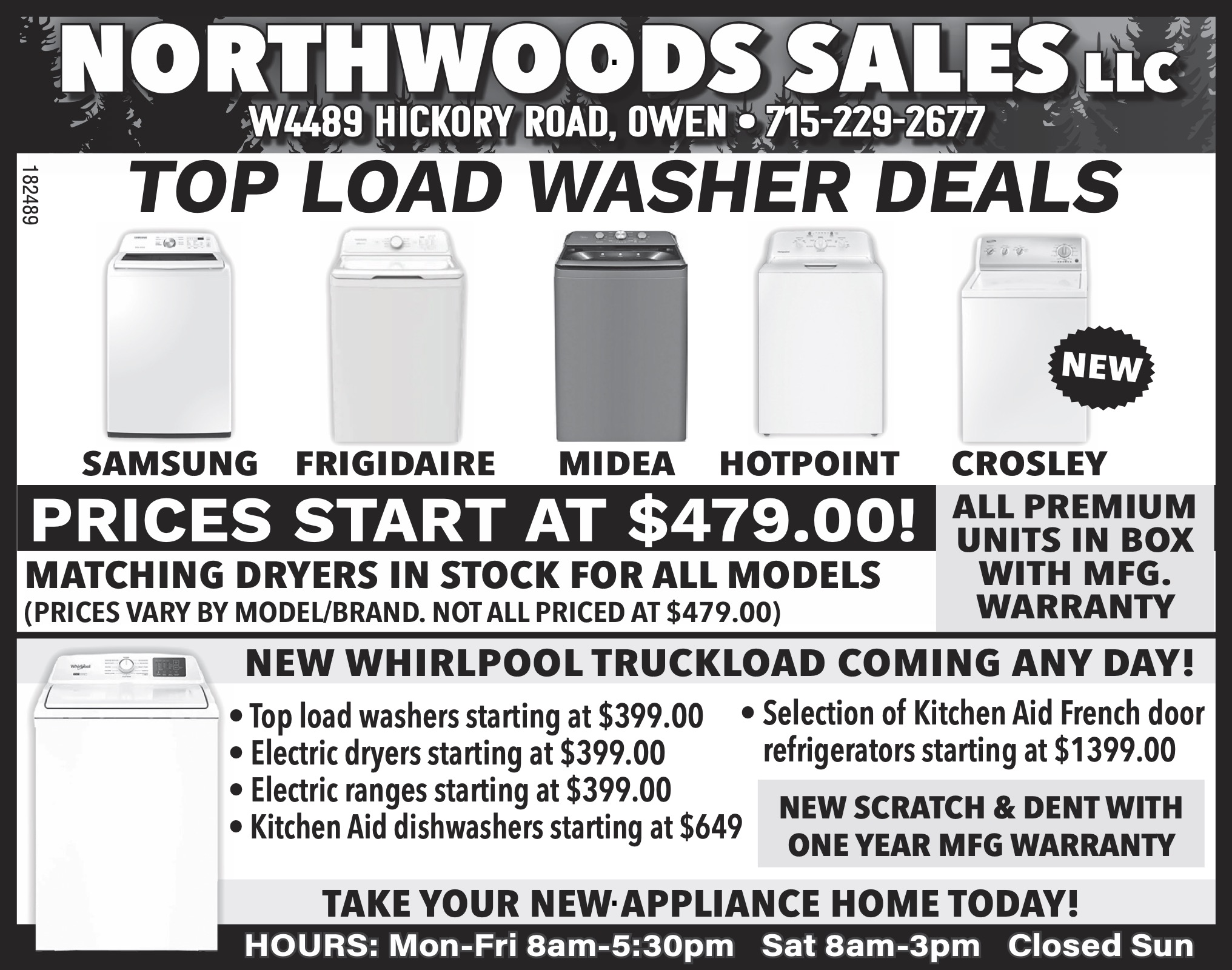 Northwoods Appliance Sales of Owen is a one-stop destination for all varieties of home appliances. Their showroom includes an extensive inventory of new name-brand appliances and scratch & dent appliances.