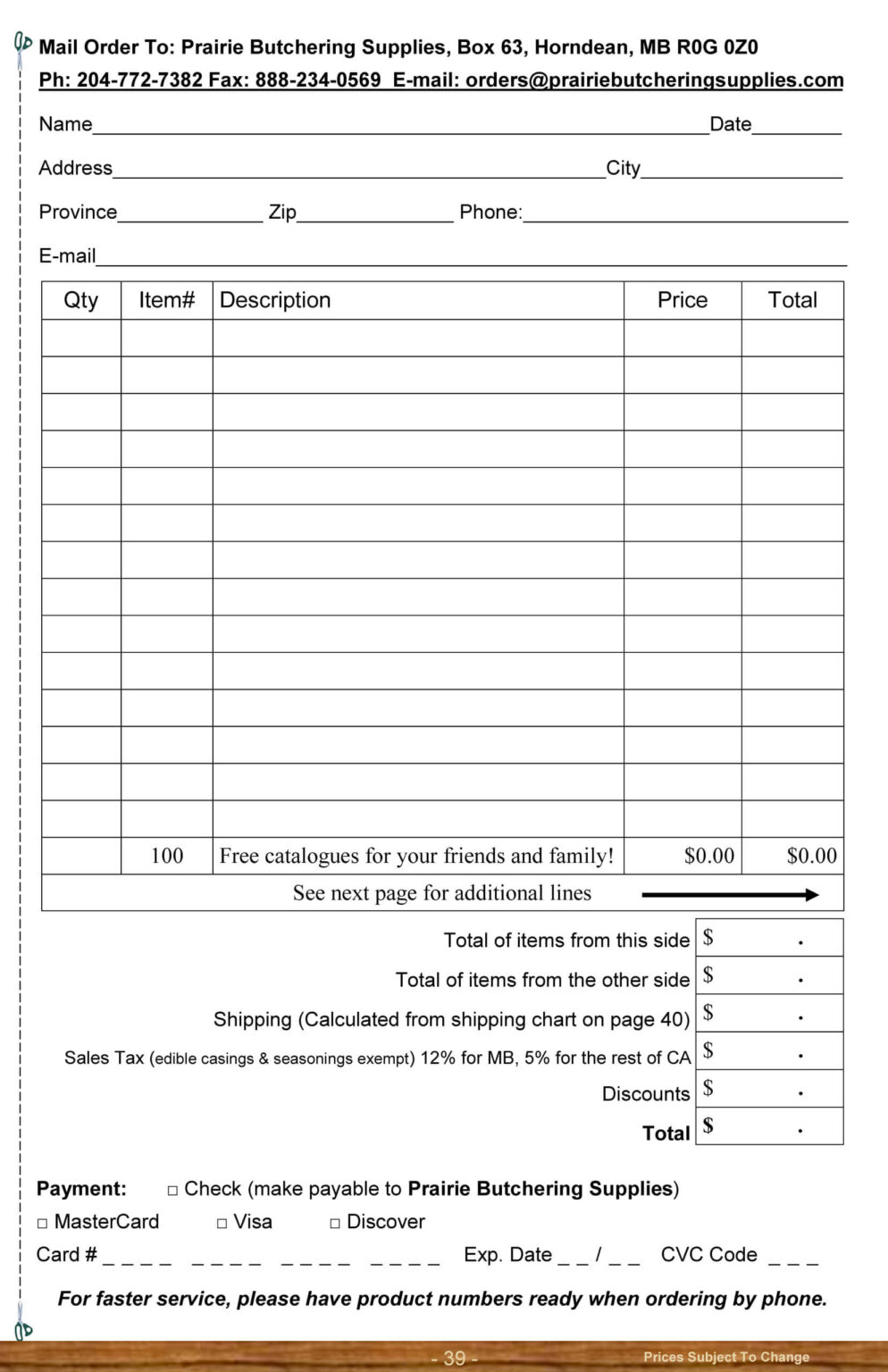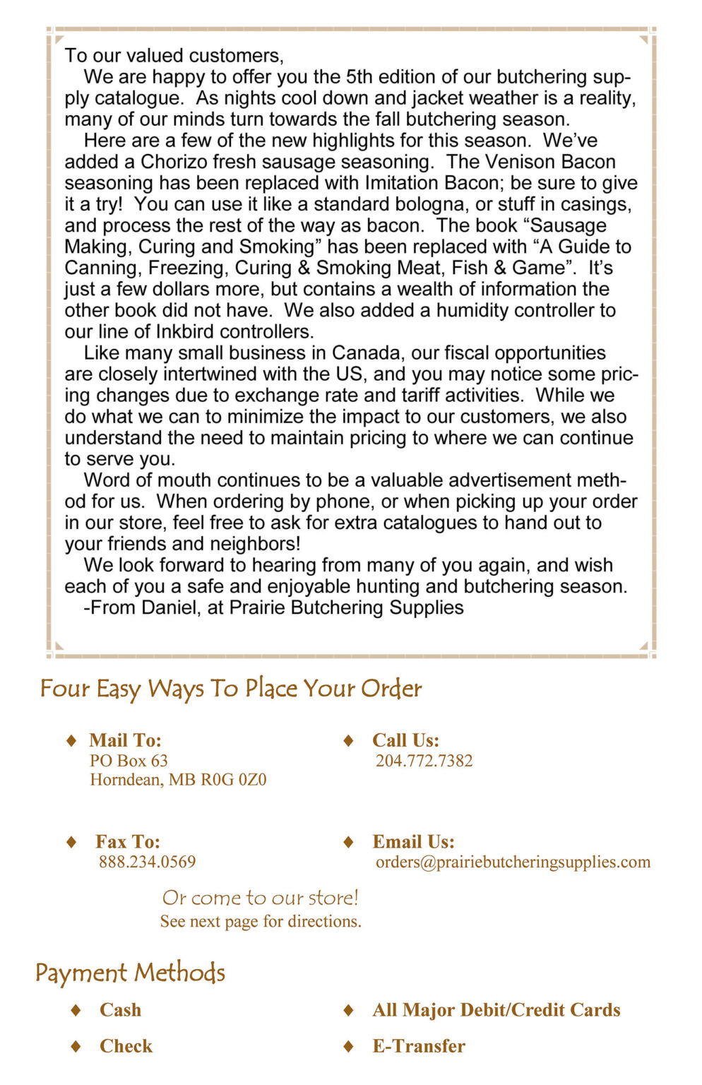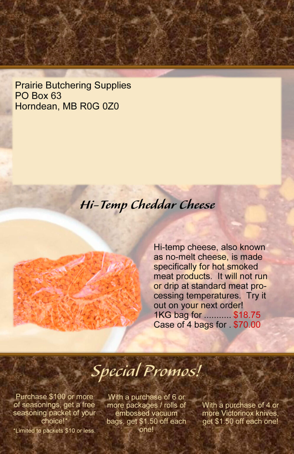 Prairie Butchering Supplies specializes in mail order for across Canada, but also welcomes customers to stop at their store if you have the opportunity.  Their goal is to help the amateur butcher process his meat from start to finish.  They also offer wholesale discounts to butcher shops or anyone who orders a large enough quantity at a time.  They look forward to hearing from you!