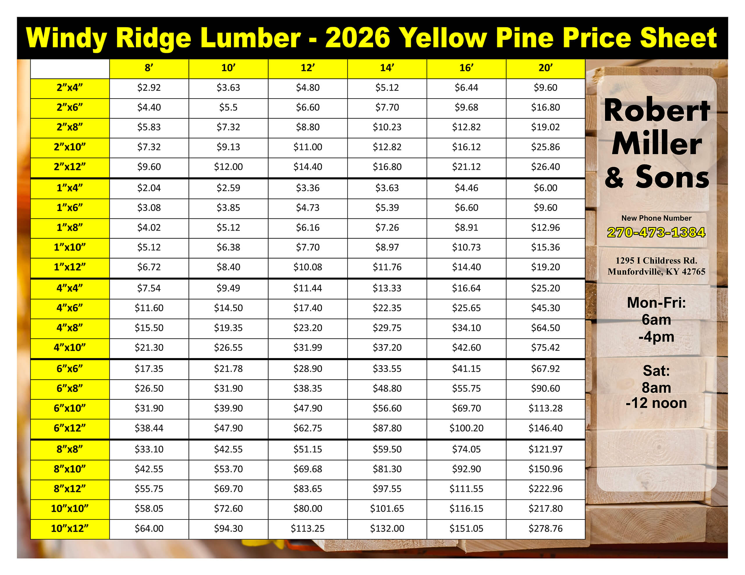 2026 price sheet for yellow pine lumber from Windy Ridge Lumber, listing prices per size and length; includes company contact info, address, and business hours.